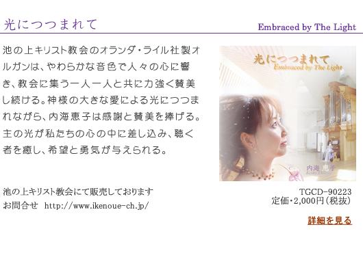 池の上キリスト教会のオランダ・ライル社製オルガンは、やわらかな音色で人々の心に響き、教会に集う一人一人と共に力強く賛美し続ける。神様の大きな愛による光につつまれながら、湊恵子は感謝と賛美を捧げる。主の光が私たちの心の中に差し込み、聴く者を癒し、希望と勇気が与えられる。