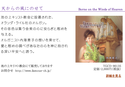 池の上キリスト教会に設置された、オランダ・ライル社のオルガン。その音色は集う会衆の心に安らぎと慰めを与える。オルガニスト湊恵子の想いを乗せて、愛と慰めの調べがあなたの心を神に抱かれる深い平安へと誘う。